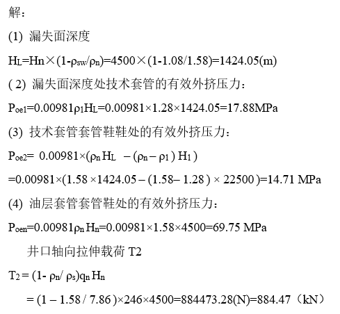 (4)若所用油层套管重量为qn=246N/m,计算油层套管套管鞋处的有效外挤压力(全掏空,单位:MPa)及井口轴向载荷(单位:kN)。(考试原题是求技术套管,记不清了)