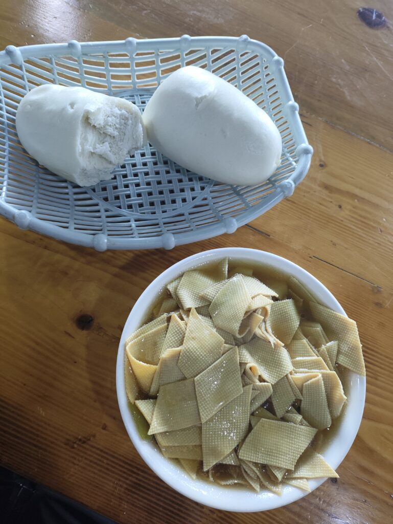 今天早上是中午醒的,醒了就穿上衣服出去吃饭。一碗豆腐皮和两个馒头,六块钱,还不错的。